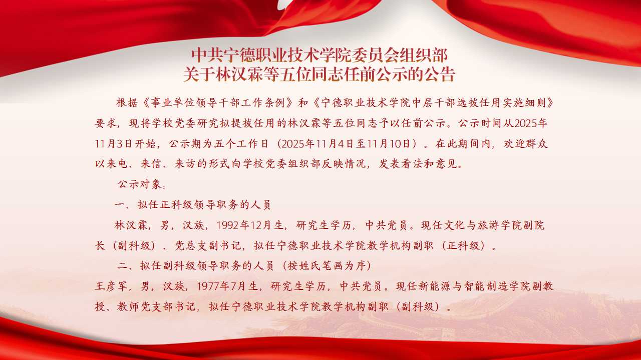 中共宁德职业技术学院委员会组织部关于林汉霖等五位同志任前公示的公告