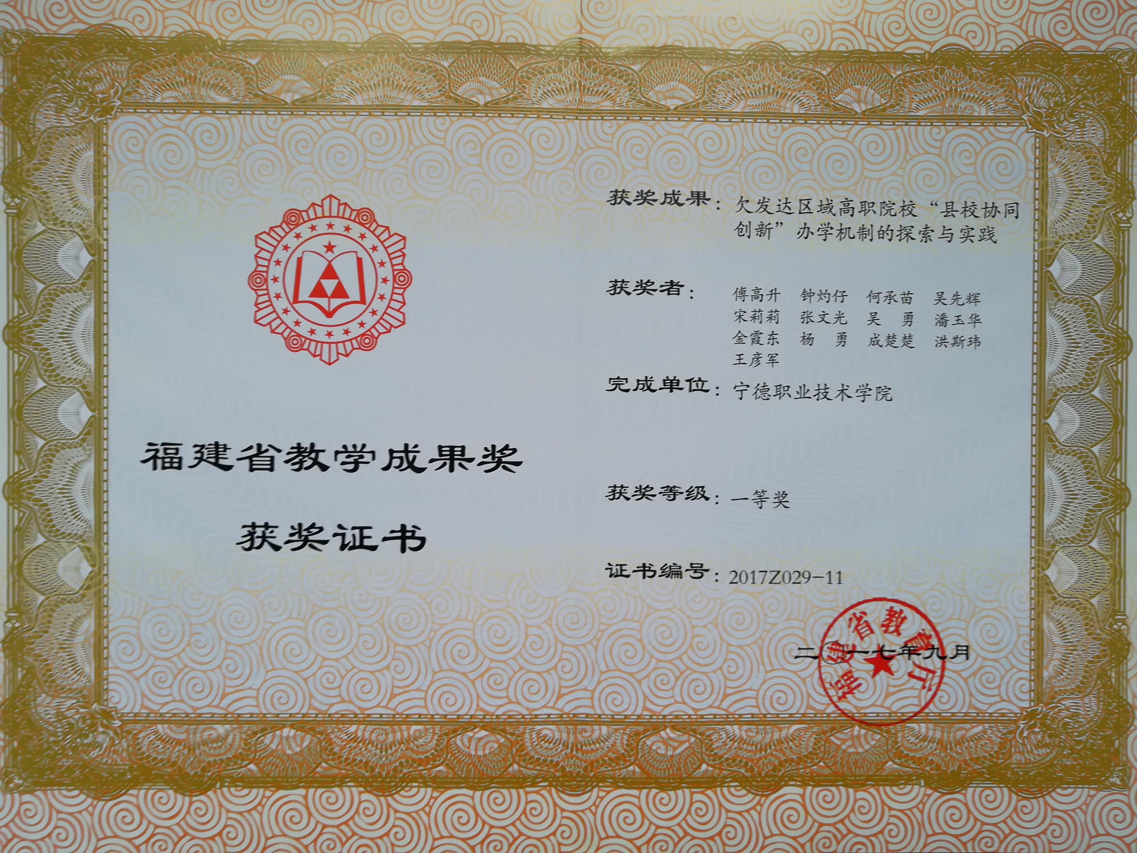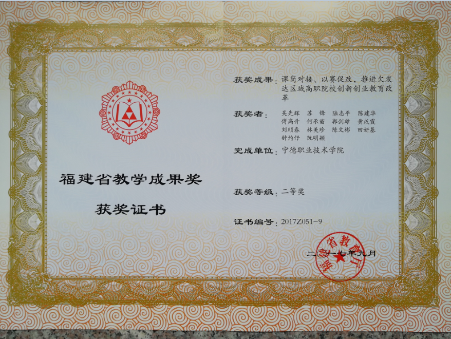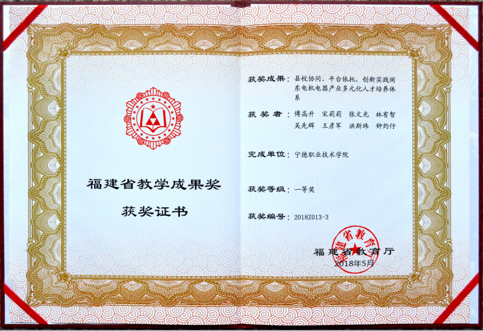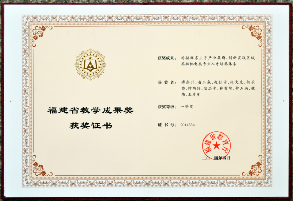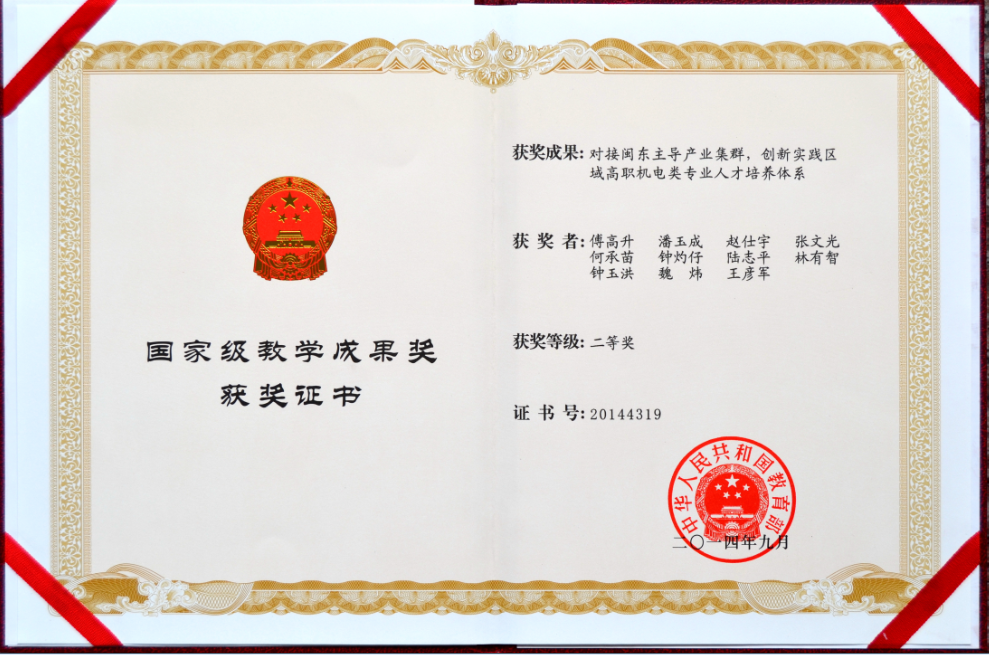 我院院长傅高升教授主持的教学成果《对接闽东主导产业集群,创新实践区域高职机电类专业人才培养体系》荣获年国家级教学成果奖二等奖。