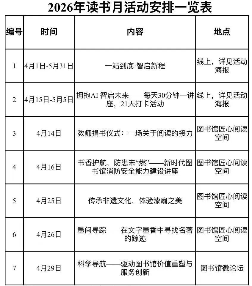 为贯彻党的二十大报告中提出的“深化全民阅读活动”精神,助力全民阅读高质量发展,引导大学生在书香中坚定理想信念、砥砺品格修养,在阅读中拓展知识视野、锤炼技能本领,值此第31个世界读书日来临之际,图书馆特开展主题为“与春同阅 书香润心”读书月系列活动。