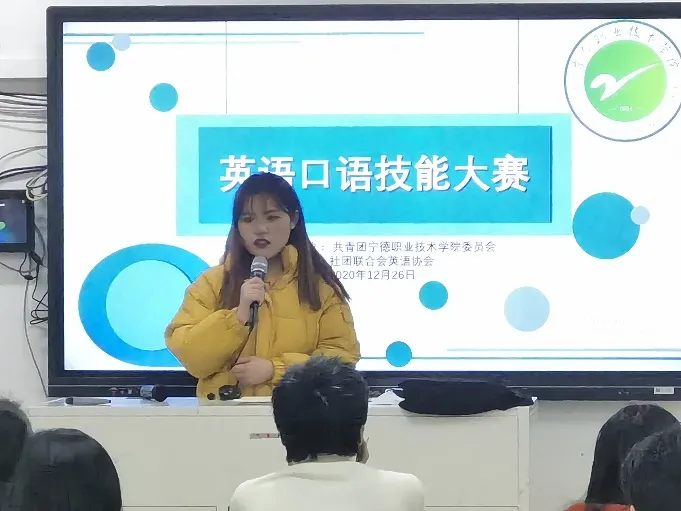 为了活跃校园文化生活,拉近英语课堂与学生生活的实际距离,提高学生的英语应用水平和交际能力,我校举办首届英语口语技能大赛。本次大赛是由共青团宁德职业技术学院委员会主办,社团联合会英语协会承办。由公共基础部吴绍容、黄旭临、王怡老师应邀担任本次大赛评委。