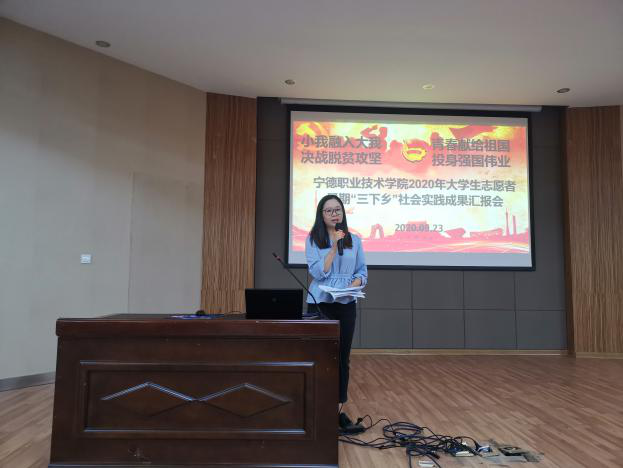 各社会实践团队汇报人从实践内容、媒体宣传、服务风采、实践心得等方面对暑期三下乡社会实践活动进行了汇报,以图文再现暑期三下乡社会实践活动的点滴,展示了在社会实践中取得的成果和收获。各支社会实践队伍或结合大学生的思想实际和社会热点问题,深入开展思政课社会实践活动;或深入农村致力精准扶贫,深入开展扶贫志愿服务活动;或深入基层,深入开展社会调查活动;或立足专业特色,深入开展实习实践活动,在社会实践的广阔舞台中,经受锻炼、收获真知。我校社会实践团队扎根农村,发扬社会实践精神,为脱贫攻坚贡献绵薄力量。