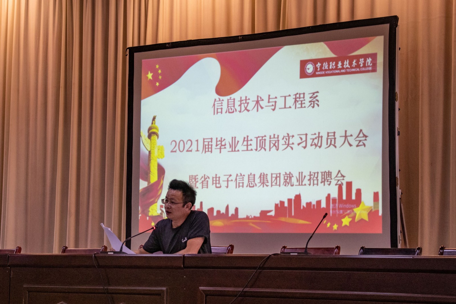 2020年9月25日下午,宁德职业技术学院信息技术与工程系于学院礼堂召开2021届毕业生顶岗实习动员大会暨省电子信息集团就业招聘会。会议由系主任苏锋主持,系书记唐寿亮、副主任张珠庭、企业代表、毕业班辅导员以及全体2021届毕业生参加本次会议。