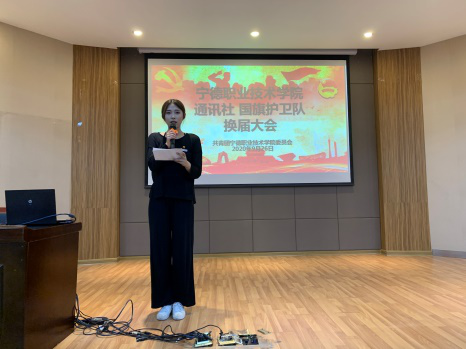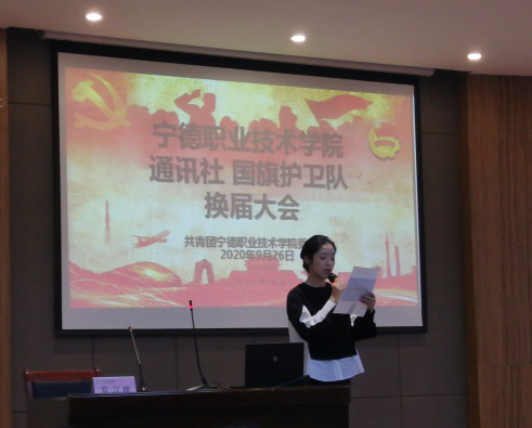 2020年9月26日,通讯社及国旗护卫队换届大会在学术报告厅举行,参加本次换届大会的老师有学院党委委员、纪委书记张平弟老师、校团委副书记周雪珍老师、院团委专职干事许建平老师以及各社社长和社员。