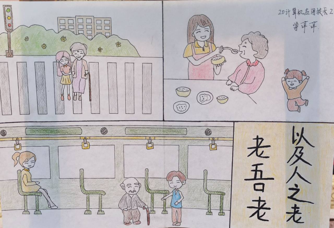 秋风送爽,丹桂飘香。我们说“老吾老以及人之老,幼吾幼以及人之幼。”是中华民族的传统美德,也是新型社会主义核心价值观的体现。作为高职院校的学子,更当注重感恩亲情,尊老敬老。10月27日,由院学生会策划举办的“九九重阳节,浓浓敬老情”宣传画作品征集完成,并在评选出了获奖的作品在学院操场旁开启展出。展出的作品画风多样,内容丰富。参与活动的同学们满怀创作热情,跃然纸上的人物、花朵、山水展现了同学们浓厚的文艺底蕴。