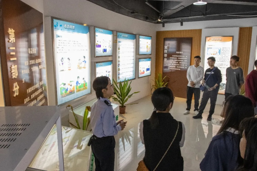 步入展厅,五面挂旗庄重的展示了历任国家领导人对禁毒工作的叮嘱。习近平总书记提到“禁毒工作是事关人民幸福安康、社会和谐稳定的一项重要工作”。可见禁毒工作事关国家安危、民族兴衰、人民福祉,厉行禁毒是党和政府的一贯立场和主张。