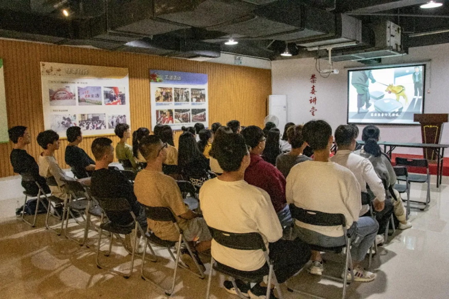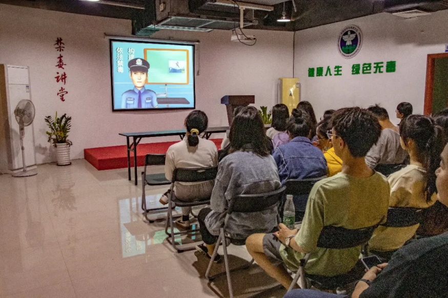 随后,占警官引导大家进入放映厅观看禁毒宣传微电影。通过动画展现不法分子如何处心积虑引诱他人染毒以及染上毒瘾之后的人的身体是如何逐渐衰弱直至死亡。当今时代飞速发展,事物变化日新月异,毒品种类也不断增多。毒品伪装成生活中常见的零食、饮料,由于与正常商品无异,极易让人在不知情下误服误用,因此更需要大家提高对陌生事物、环境的警惕。