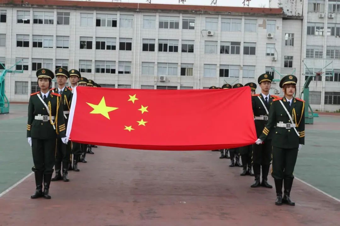 准备就绪后,国旗护卫队队员们踢踏着整齐的步伐护送五星红旗缓缓走向升旗台。在铿锵威严的《义勇军进行曲》中,在全体师生的注目礼中,鲜红的五星红旗与朝阳一同缓缓上升,旗帜飞扬若雄狮之鬃毛。